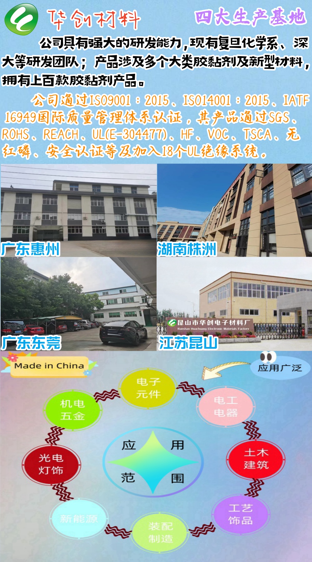 株洲華創(chuàng)新材料科技有限公司隸屬于東莞市華創(chuàng)絕緣材料有限公司分公司,旗下公司東莞市石排華創(chuàng)電子材料廠(chǎng)、昆山市華創(chuàng)電子材料廠(chǎng)、廣東華創(chuàng)電子材料有限公司;華創(chuàng)公司是以生產(chǎn)環(huán)氧樹(shù)脂膠粘劑、特殊類(lèi)環(huán)氧樹(shù)脂材料及UV膠粘劑系列產(chǎn)品為主的專(zhuān)業(yè)性企業(yè),自1999年創(chuàng)立至今,公司深耕膠黏劑行業(yè)25年,擁有320年以上膠黏劑從業(yè)經(jīng)驗(yàn)的技術(shù)人員以及復(fù)旦化學(xué)系研究人員,為華創(chuàng)創(chuàng)立專(zhuān)業(yè)的研發(fā)團(tuán)隊(duì);公司歷經(jīng)數(shù)年不懈努力和不斷創(chuàng)新,在產(chǎn)品質(zhì)量、生產(chǎn)規(guī)模和經(jīng)營(yíng)管理等方面都已取得客戶(hù)認(rèn)可;現(xiàn)生產(chǎn)產(chǎn)品已涉及環(huán)氧樹(shù)脂灌封/密封/結(jié)構(gòu)粘接、UV紫外光固化膠粘劑類(lèi)、新型環(huán)氧樹(shù)脂、特殊環(huán)氧膠黏劑產(chǎn)品、高性能環(huán)氧樹(shù)脂固化劑類(lèi)等多個(gè)大類(lèi)幾百款產(chǎn)品;其產(chǎn)品應(yīng)用于各類(lèi)電子元件、光電燈飾、電工電器、汽車(chē)電路、工藝飾品、機(jī)電五金、裝配制造、土木建筑、新能源等諸多領(lǐng)域;致力為行業(yè)提供全面、一體化的膠粘劑解決方案。